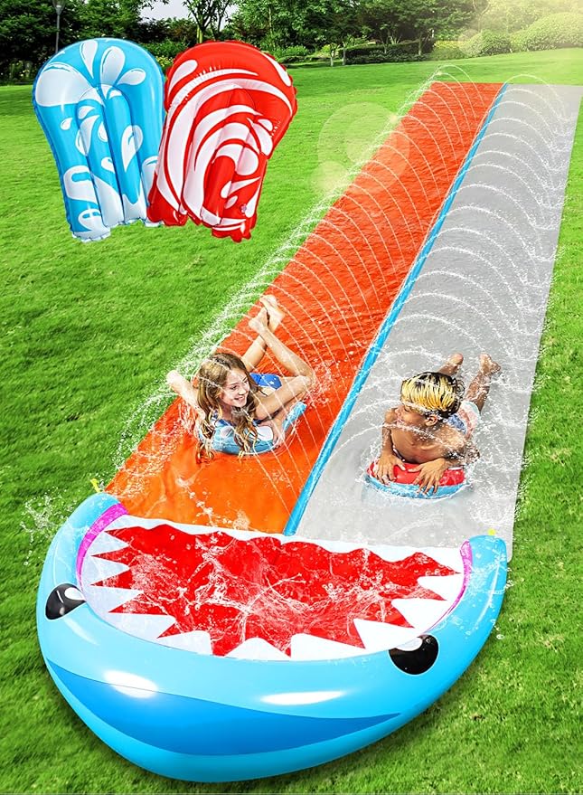 Sloosh Water Slides with 2 Inflatable Boards,22.5ft Double Lane Lawn Water Splash Slip and Slide