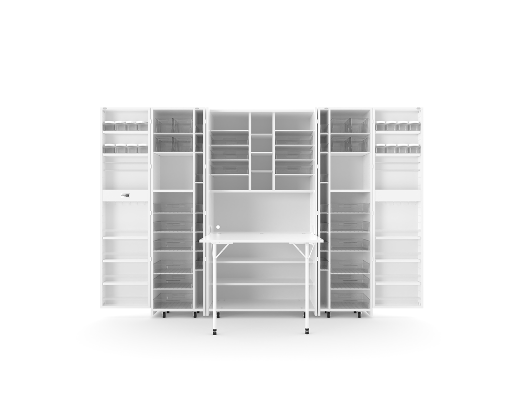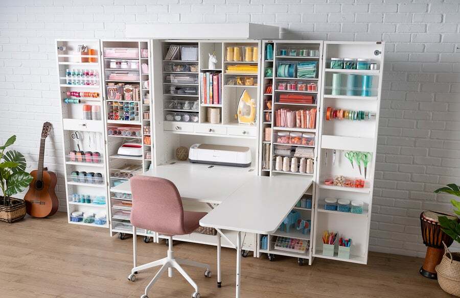 Your mobile "create room" hides-away into a beautiful armoire, saving space.
