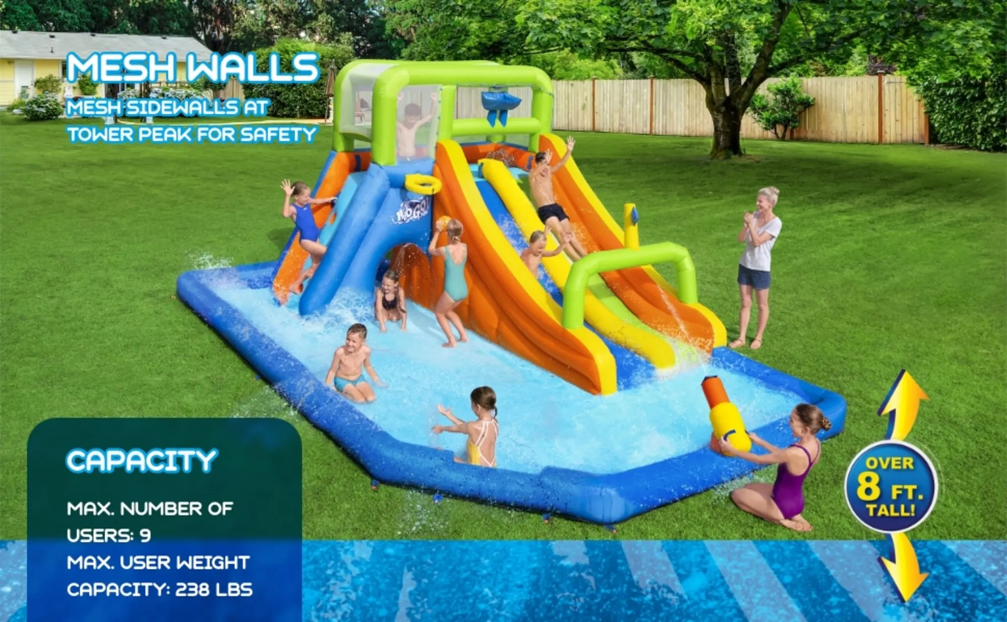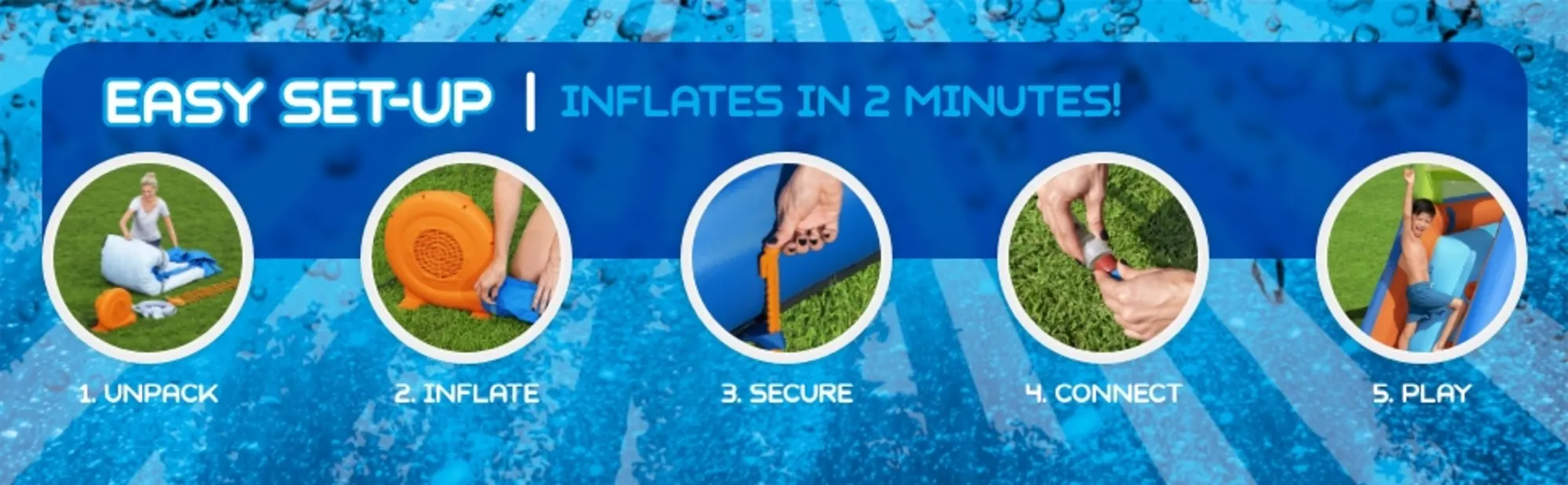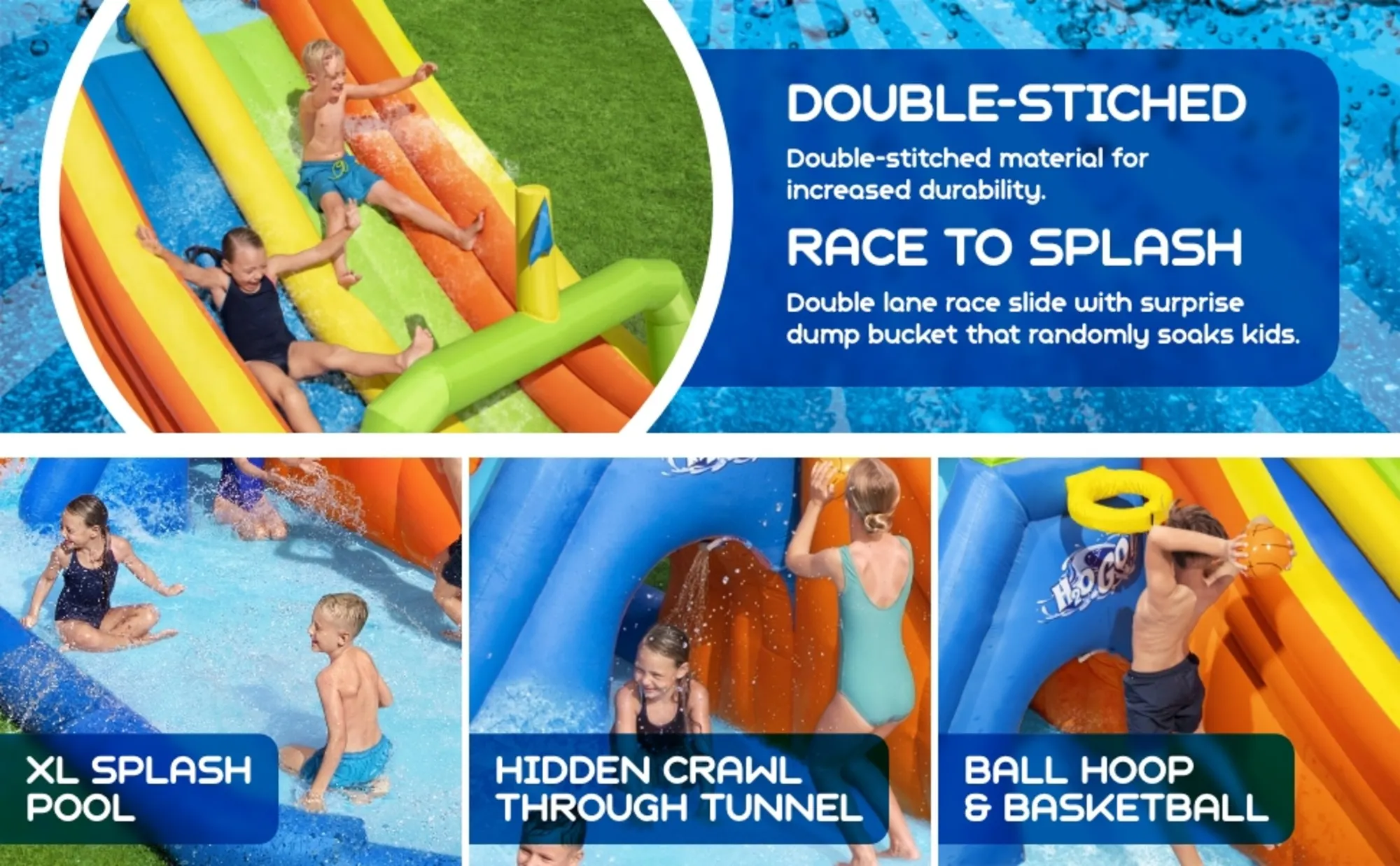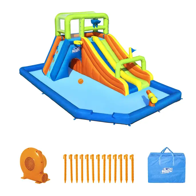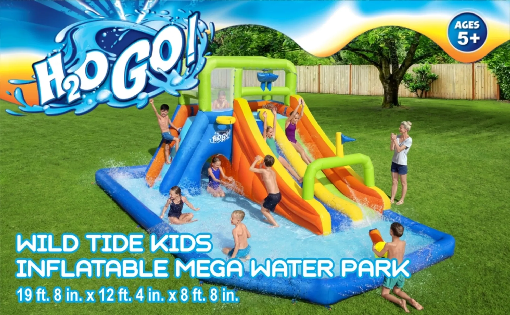 The perfect addition to any barbeque, birthday or block party is here with the H2OGO!® Wild Tide Kids Inflatable Water Park! The park features two slides with safety bumpers and a surprise dump bucket so kids can race all day long. There’s plenty to explore with an extra-large play pool that leads to a secret tunnel under the climbing wall. Kids can also dunk and shoot the included basketball through the hoop for a fun game. The park also features a built-in water blaster for soaking the slides (or friends) - just point and spray! The wall leads to the tower deck that’s secured with mesh walls for stability and safety. The park is constructed of double-stitched, PVC-coated polyester material that is super durable and provides a comfortable feel and touch for kids, keeping the fun splashing year after year. The included heavy-duty blower effortlessly inflates the water park in less than 2 minutes, so the H2OGO! Wild Tide Inflatable Water Park can go from the box to party-mode in no time!