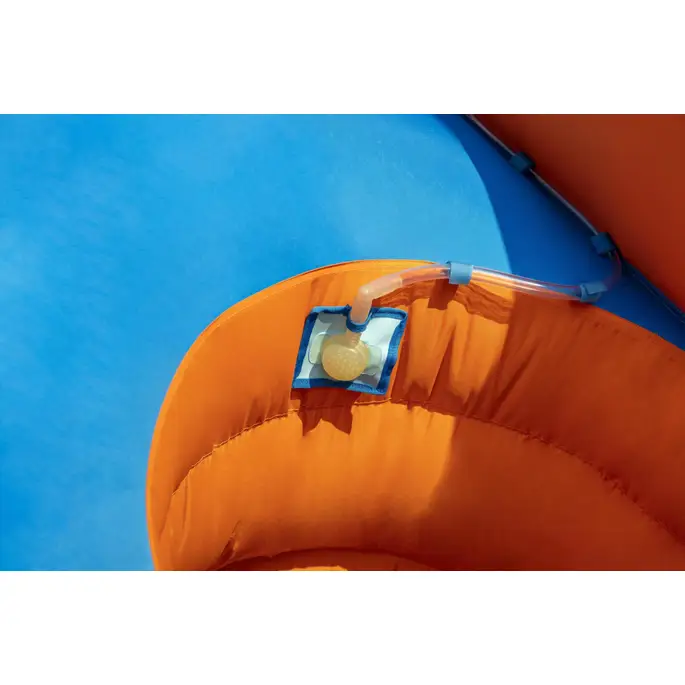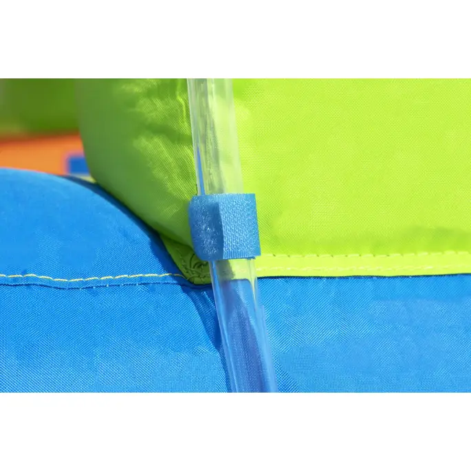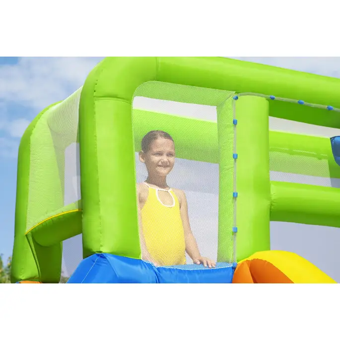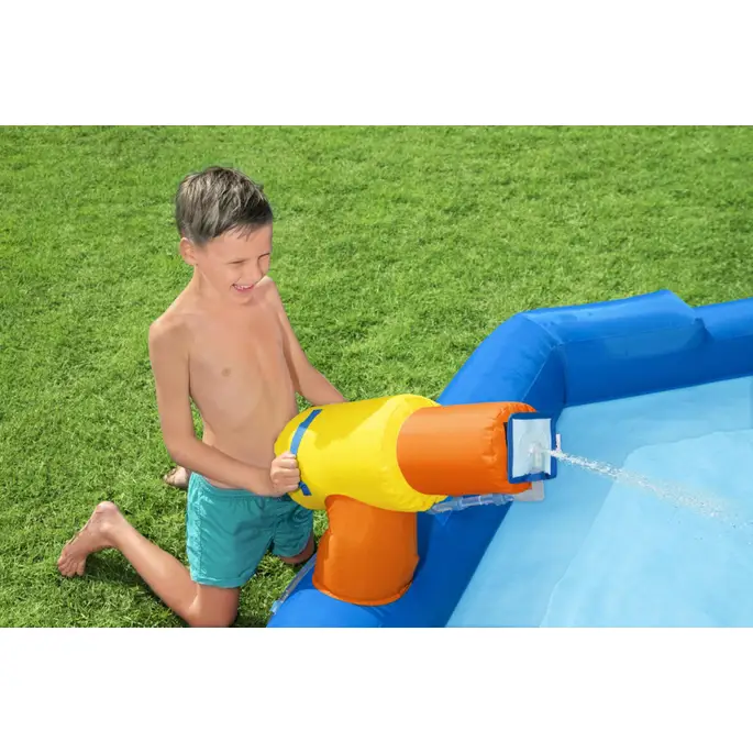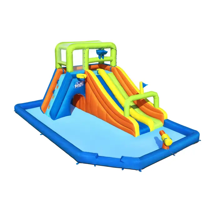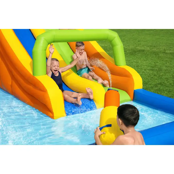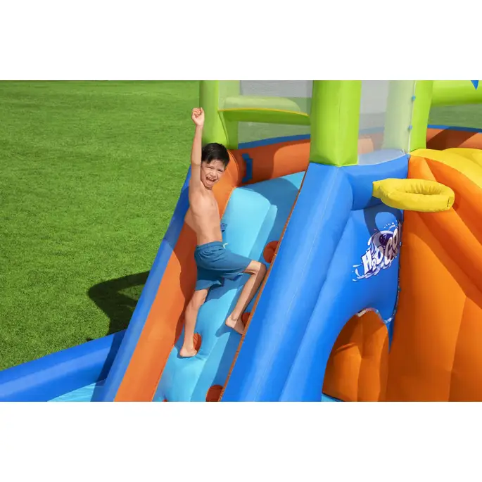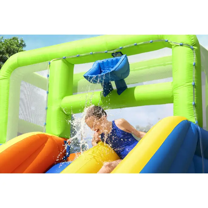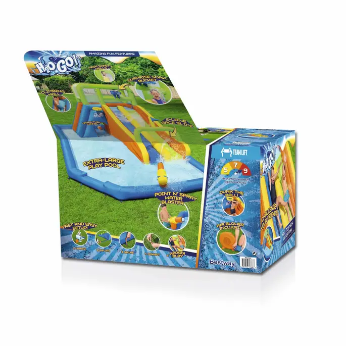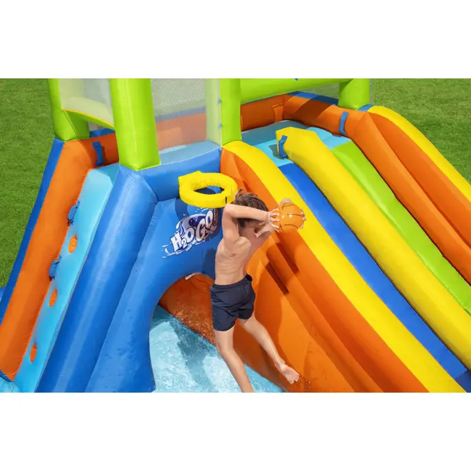 The perfect addition to any barbeque, birthday or block party is here with the H2OGO!® Wild Tide Kids Inflatable Water Park! The park features two slides with safety bumpers and a surprise dump bucket so kids can race all day long. There’s plenty to explore with an extra-large play pool that leads to a secret tunnel under the climbing wall. Kids can also dunk and shoot the included basketball through the hoop for a fun game. The park also features a built-in water blaster for soaking the slides (or friends) - just point and spray! The wall leads to the tower deck that’s secured with mesh walls for stability and safety. The park is constructed of double-stitched, PVC-coated polyester material that is super durable and provides a comfortable feel and touch for kids, keeping the fun splashing year after year. The included heavy-duty blower effortlessly inflates the water park in less than 2 minutes, so the H2OGO! Wild Tide Inflatable Water Park can go from the box to party-mode in no time!