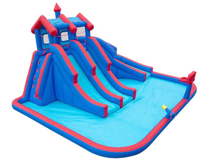 Make playtime an adventure with this watery wonder from Sunny & Fun. Easily set up in minutes with the included air pump, this inflatable water park features a climbing wall on one side leading to an exciting descent via three exciting slides. Triple the fun with triple the slides!