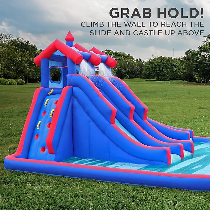 3 SPLASHING FUN FEATURES – Climbing Wall, 3 Water Slides & Splash Down Pool Provide a Variety of Watery Activities; Keeps Multiple Kids Entertained at Same Time