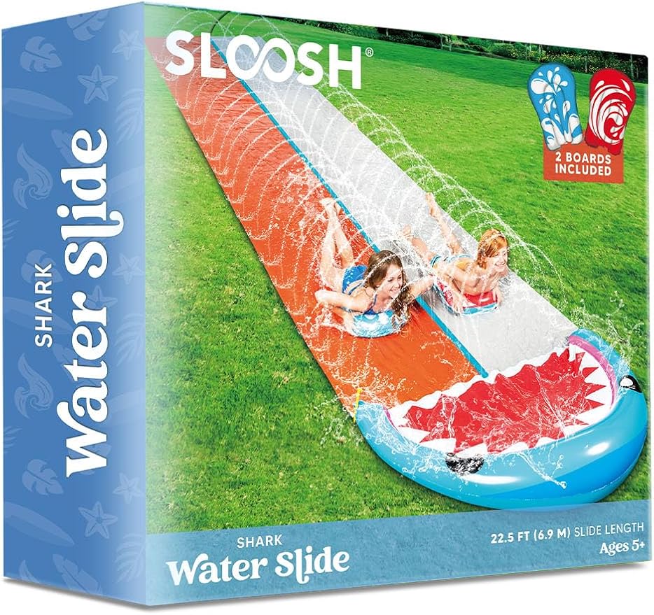 Deluxe Set with 2 Boards: This set includes a Orange Pattern Extra Large Slide measuring 20ft X 62in along with 2 Boards to slide and ride on. boards provide a much more fun sliding experience.